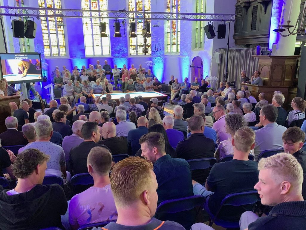 Goed ademhalen stond toch centraal tijdens de tweede sponsoravond van Sam, die woensdag 3 september 2025 voor de tweede maal werd gehouden. Regelmatig hielden de biljartfans in de magisch verlichte kerk hun adem in als Sam en eregast Torbjörn Blomdahl trachten de ballen op het fel verlichte biljart de juiste kant op te sturen. Om uit te blazen als het weer gelukt was.