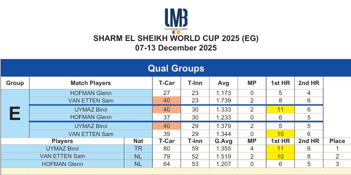 Omdat Hofman ook zijn tweede partij, tegen de Turk Uymaz, verloor (37-40), was de derde partij in de poule beslissend. Sam trok daarin direct fel van leer. Na drie beurten leidde hij al met 15-3 (na een serie van 10 in de openingsbeurt) en bij de break had hij een ruime 21-8 voorsprong.