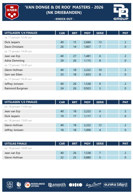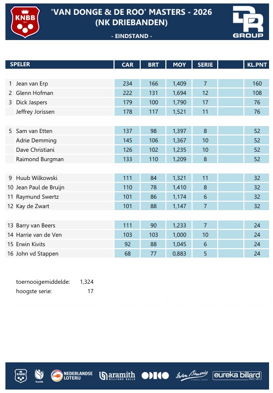 ‘Ik ben uiteindelijk tevreden met mijn optreden in Berlicum,’ vertelde Sam na afloop. ‘Glenn was vandaag gewoon te sterk voor mij. Ondanks dat ik hem onder druk zette scoort hij tot een moyenne van 2,222. Daar kon ik zelfs met mijn moyenne van 1,833 niet tegen op. Maar ik heb laten zien dat ik op de goede weg ben. Uiteindelijk word ik vijfde en ben ik in het toernooi gegroeid en heb ik gespeeld wat ik kon. Daar ben ik tevreden mee. Tevens ben ik over 2025 ook vijfde geëindigd op de nationale ranglijst, waarmee ik plaatsing voor het Europees Kampioenschap in maart in Antalya heb afgedwongen. Een mooie stap en uitdaging.’