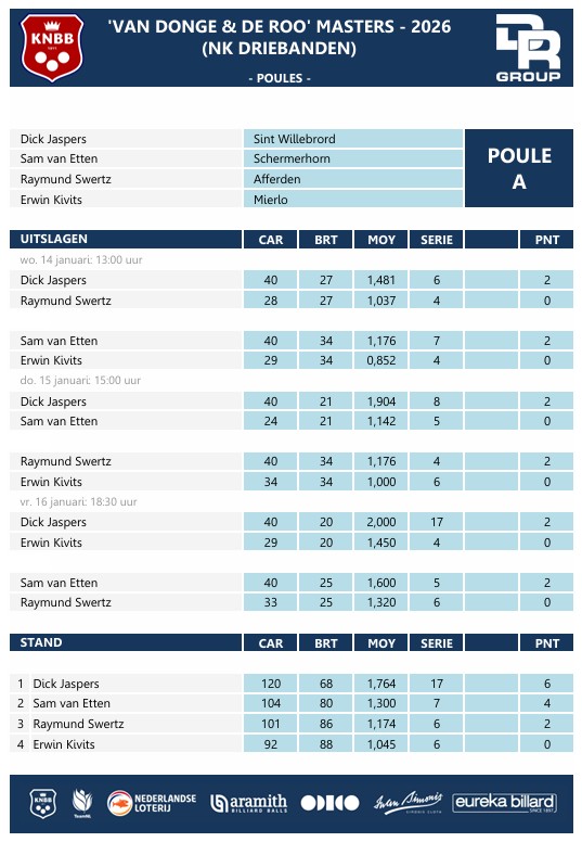 In de poulefase stuitte hij op 23-voudig nationaal kampioen Dick Jaspers, Erwin Kivits (Mierlo) en Raymund Swertz (Afferden). Omdat de beste twee uit de poule een ronde verder kwamen, was het doel in ieder geval een plek in de knock-outfase te bemachtigen.