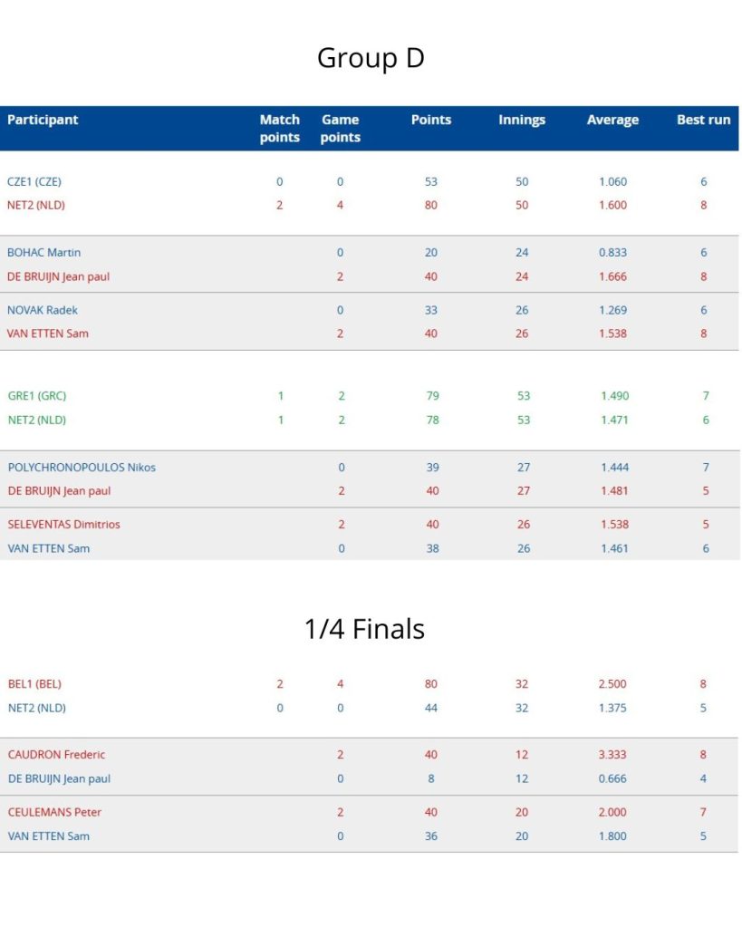 De kwartfinale tegen België 1, met kersvers Europees kampioen Peter Ceulemans en regerend wereldkampioen Frédéric Caudron, eindigde in mineur. Nadat De Bruijn een forse 40-8 nederlaag tegen Caudron kon alleen winst van Sam Nederland nog redden. Lang leek dat goed te gaan, maar uiteindelijk leed hij dus een nipte 36-40 nederlaag tegen Ceulemans, na een goede slotserie van 7. Daarmee kwam voor Sam een einde aan zijn eerste Europees titelstrijd waar hij desondanks met veel genoegen op kan terugkijken.