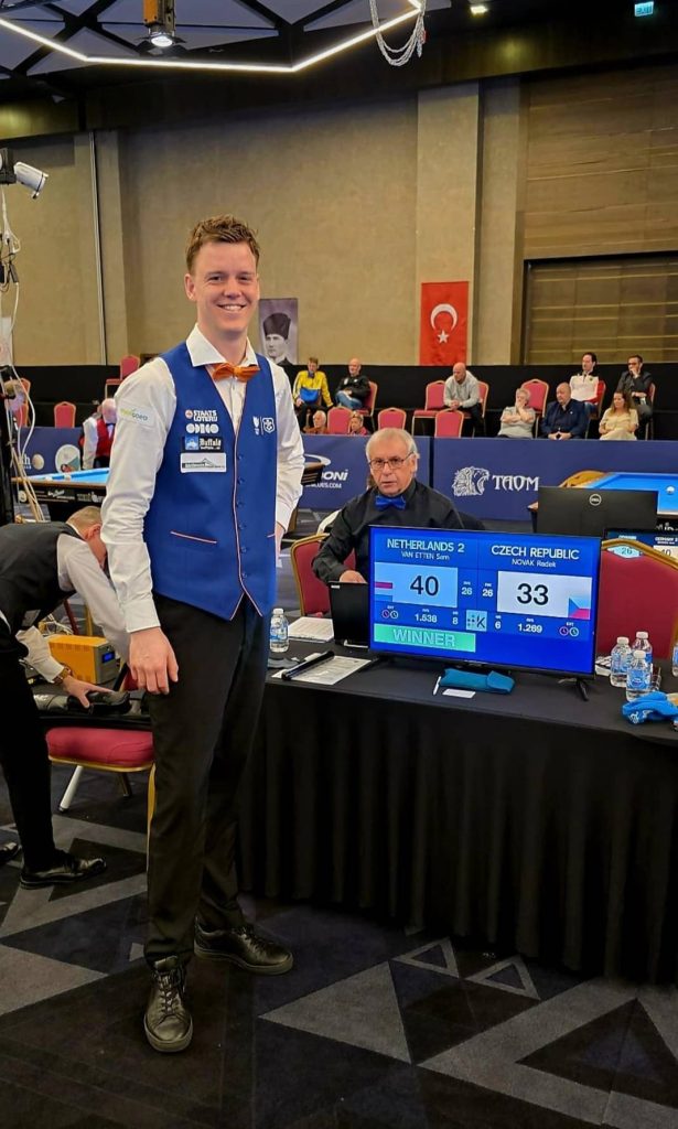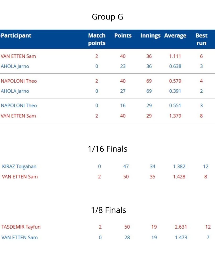 De Fin Ahola (40-23), de Albanees Napoloni (40-16) en de Tsjech Novak (40-33) liet hij kansloos. Ook won hij in het individuele toernooi van Tolgahan Kiraz. In 2024 had Sam de Turkse biljarter al eens verslagen tijdens de World Cup in Ankara, en ook nu leek hij af te stevenen op een ruime overwinning. Bij de stand 42-24 in het voordeel van Sam maakte Kiraz echter series van 12 en 10 waardoor het toch nog spannend werd.