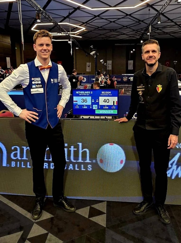 ‘Voor mijn gevoel ging het eigenlijk helemaal niet zo goed,’ bagatelliseerde Sam zijn sterke optreden tegen de kleinzoon van biljart-legende Raymond Ceulemans. ‘Ik had geen lekker gevoel, maakte veel fouten en het lukte me niet om met een serie afstand te nemen. Aan het eind maakte Ceulemans het heel goed af, zoals hij eigenlijk het hele toernooi deed.’